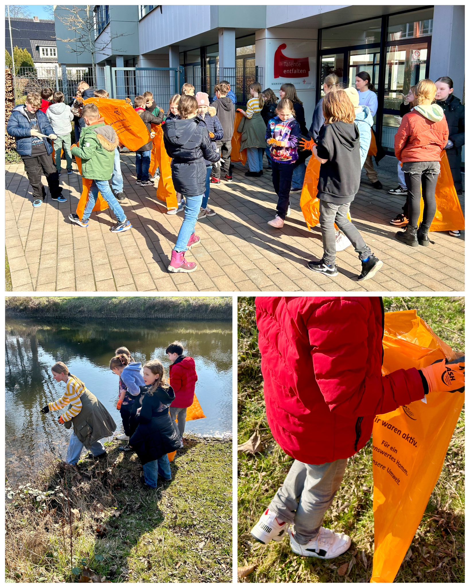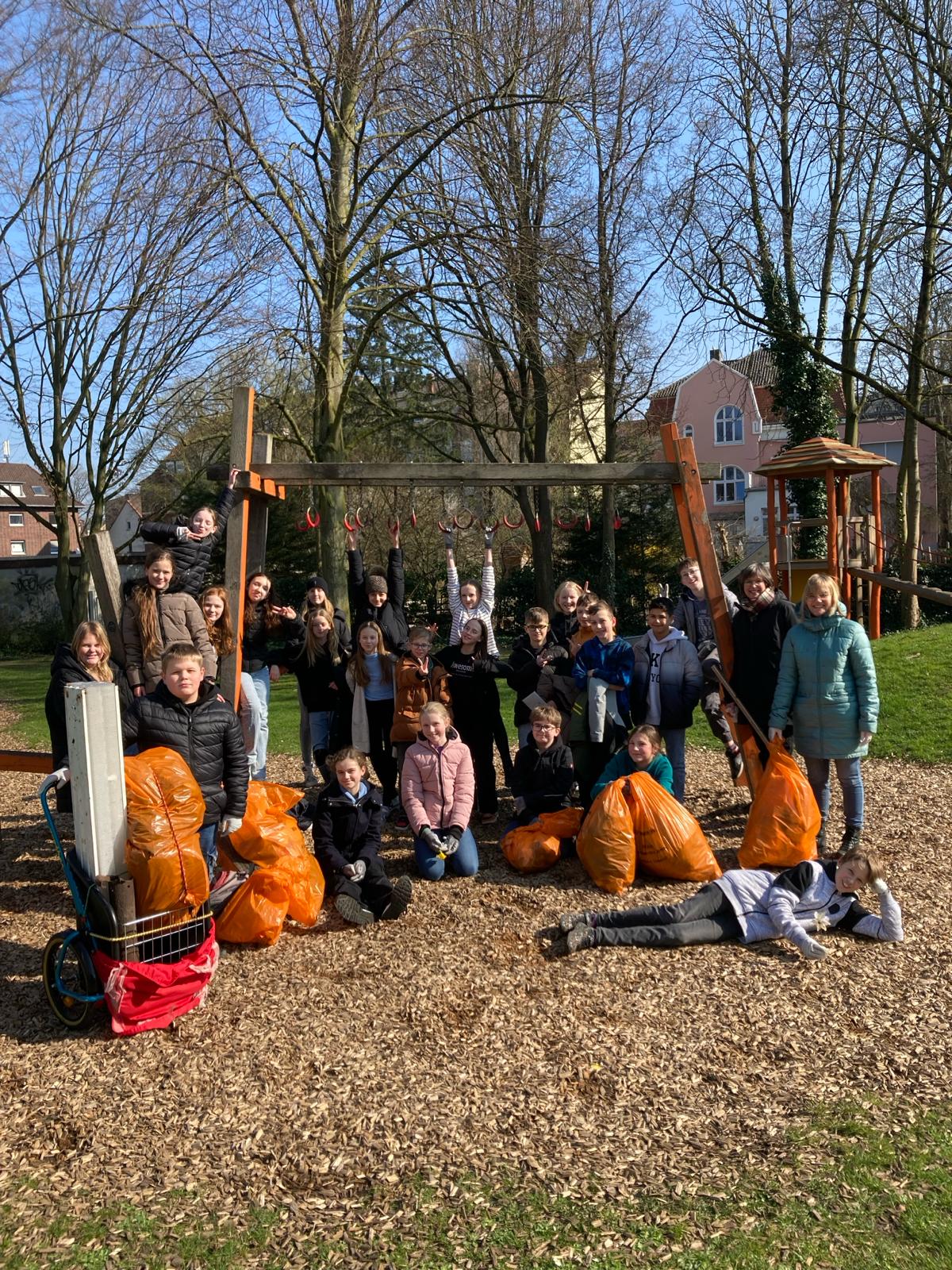 Sehr erfolgreich waren die Schülerinnen und Schüler der 5c und 6c, die am Freitag, den 8.März gemeinsam mit ihren Klassenlehrerinnen am Ostring und Ostenwall die Umwelt von Müll befreiten und damit an der diesjährigen Frühjahrputz-Aktion der Abfallwirtschaft und Stadtreinigung Hamm teilnahmen. Neben Lampen, Decken und Schuhen fanden sie noch allerlei Kuriositäten, die in Gebüschen definitiv nichts zu suchen haben. Die Kinder packten so fleißig mit an, dass die orangefarbenen Säcke der ASH am Ende kaum noch zu tragen waren.