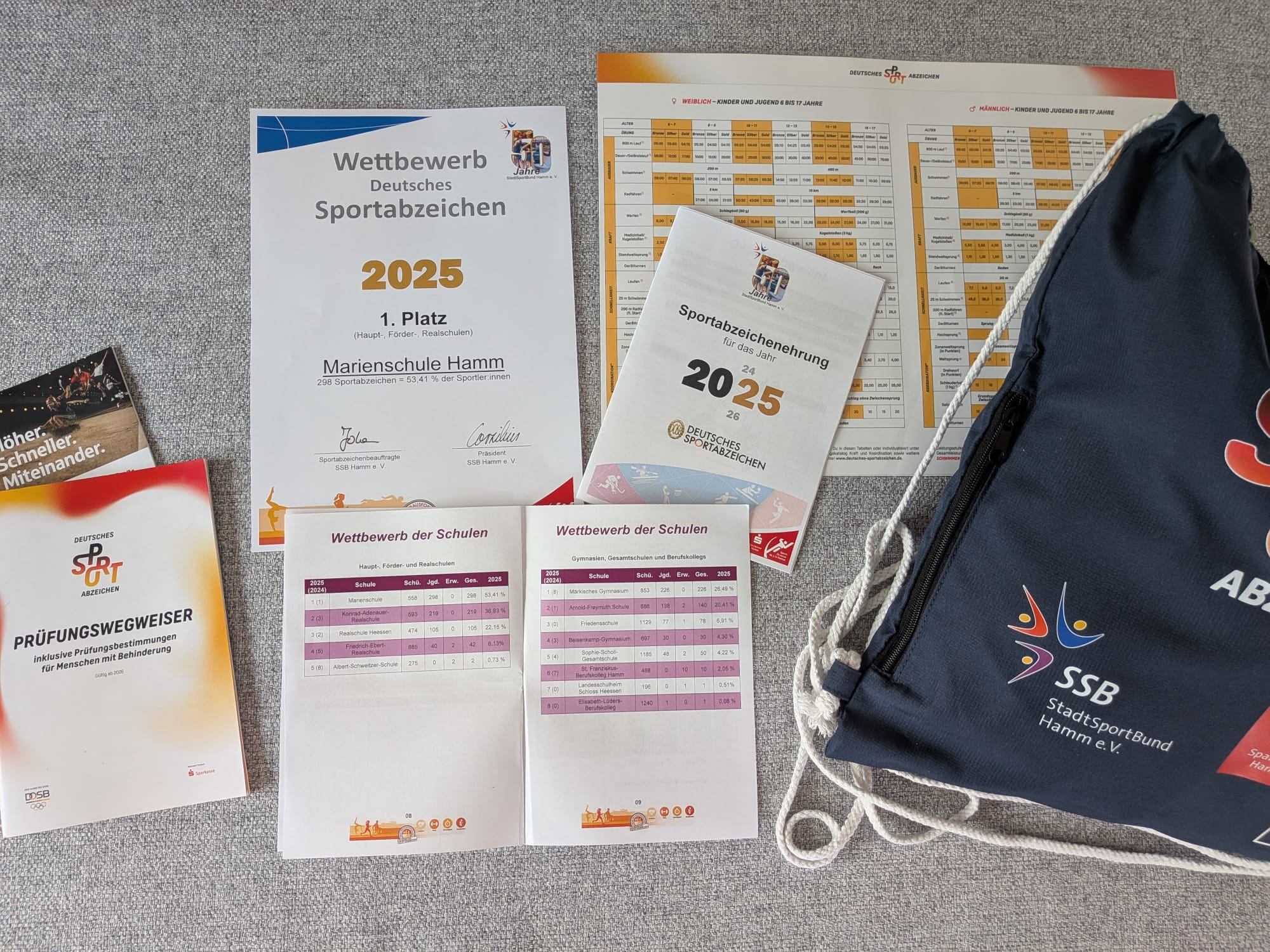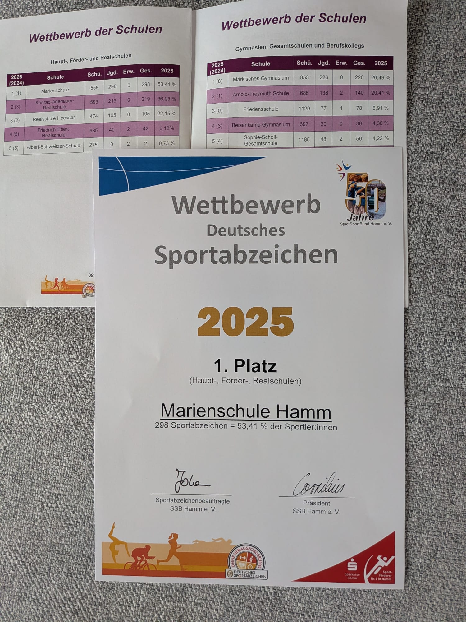 Besonders erfreulich ist das Ergebnis der Marienschule: Wie bereits im Jahr 2024 erreichte sie den 1. Platz unter den Haupt-, Förder- und Realschulen. Mehr als die Hälfte der Schüler:innen (298 von 558 Schüler:innen) legte ein Sportabzeichen ab – ein beeindruckender Beleg für das sportliche Engagement und den Teamgeist an unserer Schule. Wir sind stolz auf diese Leistung und gratulieren allen Beteiligten herzlich zu ihrem Erfolg!