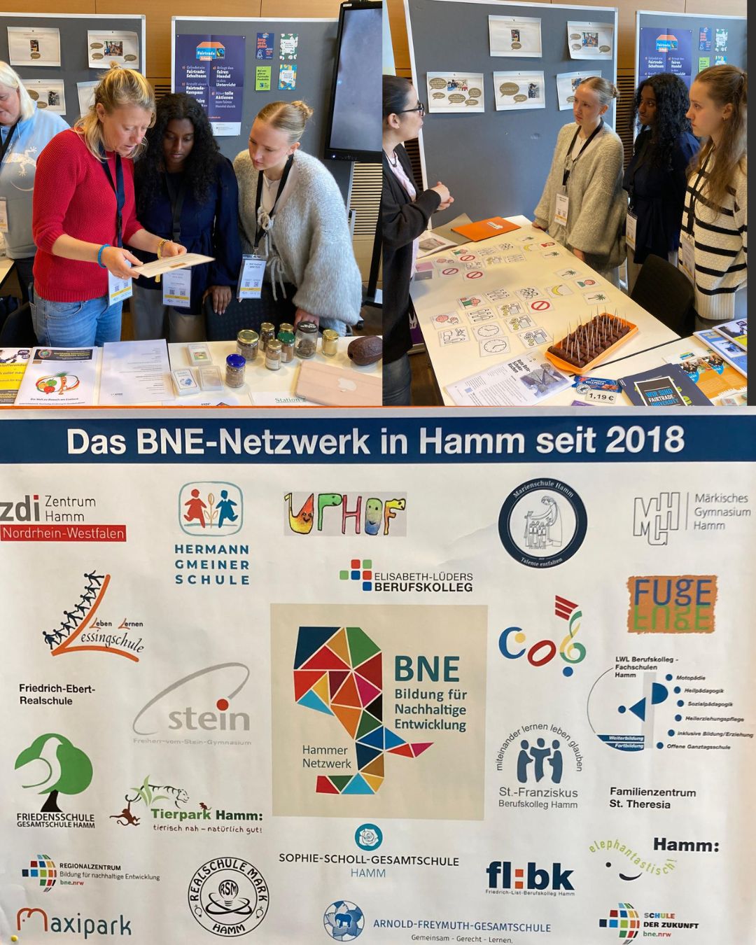 In der Woche vor den Ferien nahmen Schüler:innen unserer Schule am BNE-Festival (Bildung für nachhaltige Entwicklung) in der VHS in Hamm teil. Zusammen mit der FUgE, dem Elisabeth-Lüders Berufskolleg und der fairen Martin Luther Kita stellten sie unsere Arbeit als Fairtrade-School vor. Dabei konnten sich die Besucher:innen des Festivals Podcasts anhören, die in unserem Podcast Studio mit den anderen Fairtrade-Schools aufgenommen wurden.